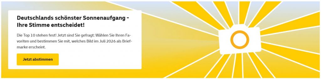 Die Top 10 aus den im September 2025 eingereichten Fotos mit dem schönsten Sonnenaufgang Deutschlands stehen fest. Im zweiten Schritt muss nun das Siegerfoto ermittelt werden. Auf der Startseite von shop.deutschepost.de kann bis zum 11.11.2025 jeder seine Stimme für seinen Favoriten abgeben. Das meistgewählte Foto wird im Juli 2026 als Motiv auf einer Briefmarke erscheinen.