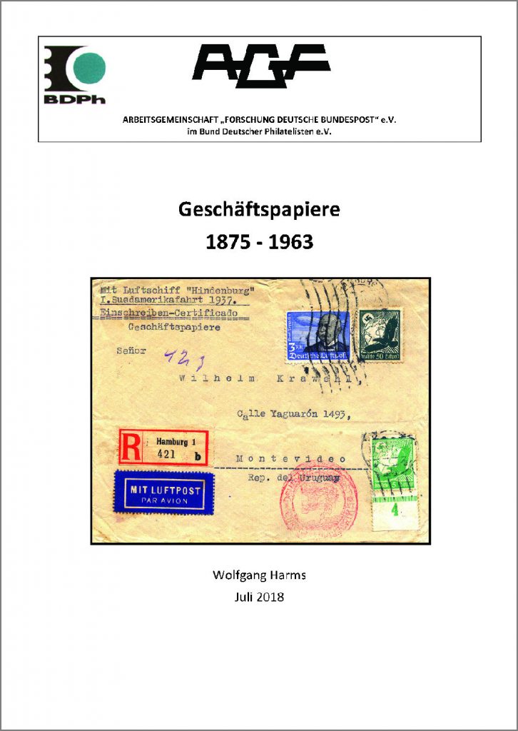 Geschäftsleute konnten von 1875 bis 1963 ihre „Geschäftspapiere“ zu Sonderkonditionen mit der Post versenden. Diese weitgehend unbekannte Versandart hat Wolfgang Harms aufgegriffen und in einem Heft (A4, 152 Seiten) reich bebildert beschrieben.