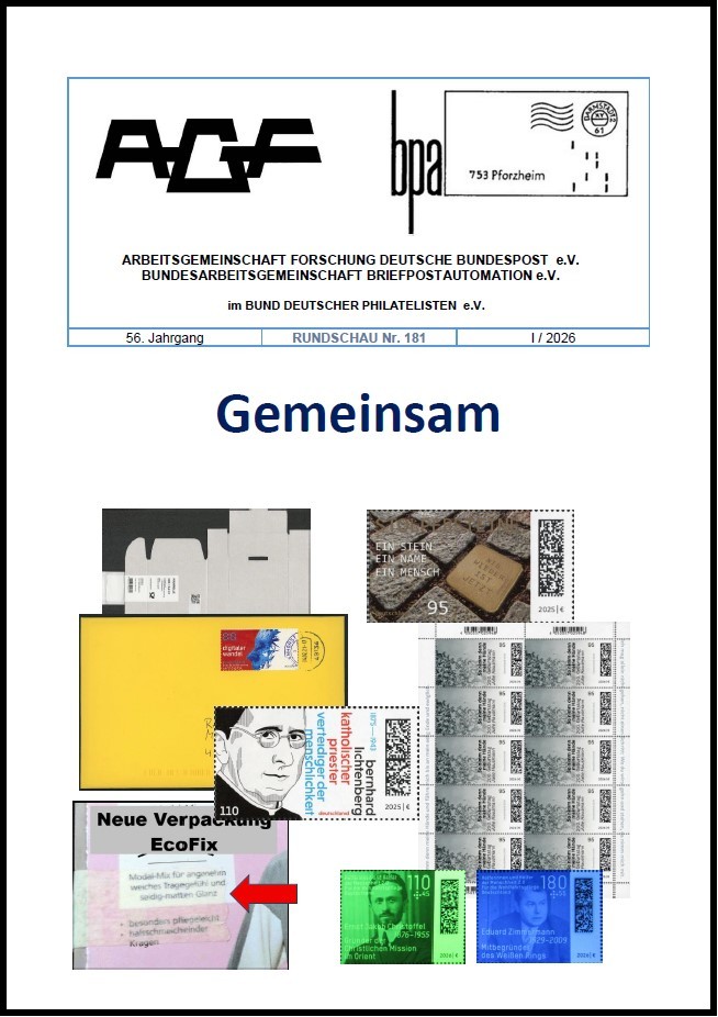 Seit April 2026 ist die Rundschau Nr. 181 – I/2026 mit 48 Seiten verfügbar. Hinweis:Erstmals werden die Beiträge der beiden Arbeitsgemeinschaften „AGF – Forschung Deutsche Bundespost e.V.“ und „Briefpostautomation e.V.“ in einer Gemeinschaftspublikation veröffentlicht. Sie …